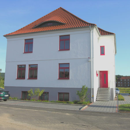 Das vorhandene Gebäude ist umfassend umgebaut und modernisiert worden. Im Kellergeschoss wurde die Raumhöhe erweitert, da das Geschoss auch als Bürobereich genutzt werden soll. Hierfür musste der Boden tiefer ausgeschachtet werden und die tragenden Wände Teilstück für Teilstück nach unten stabilisiert werden. Eine Abdichtung der Kellersohle und der Wände erfolgte. Die Raumaufteilung und Fenster- und Türöffnungen wurden teilweise verändert. Das Dach ist in einem Teilbereich neu gerichtet worden, es erhielt aufgrund des geplanten Dachgeschossausbaus Verstärkungen an Sparren und Pfetten und eine zusätzliche Gaube. Das Dach wurde neu mit Hohlfalzziegeln eingedeckt. Die komplette Haustechnik ist erneuert worden. Das vorhandene geputzte Außenmauerwerk wurde mit einem Wärmedämmverbundsystem versehen und erhielt neue Aluminium-Fenster mit Isolierverglasung und Aluminium-Außentüren. Es konnten die vorhandenen Holztreppen und der Parkettfußboden während der Bauphase geschützt und aufgearbeitet werden.