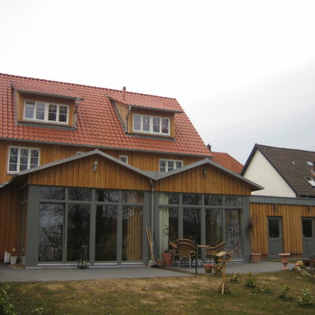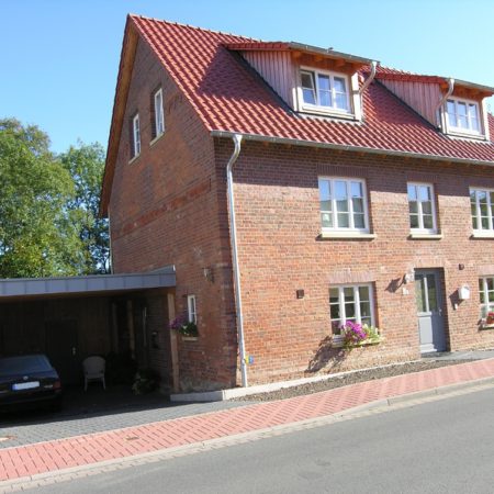 Das Gebäude ist Teil der denkmalgeschützten Mühlenanlage in Ahnsen, diente früher als Wohnhaus des Müllers und wurde großteils entkernt. Der Anbau wurde abgerissen und stattdessen ein Carport errichtet. Die Fassaden aus Ziegelmauerwerk sind von außen gereinigt und neu verfugt worden. Von innen erhielten die Außenwände eine neue tragende Innenschale aus Kalksandstein und der Zwischenraum wurde mit Dämmung gefüllt. Der neue Boden und die Decken bestehen aus Stahlbeton mit einem Aufbau aus Dämmung und Zementestrich. Die gartenseitige Fassade erhielt eine Erweiterung des Wohnraums im Erdgeschoss mit einer großflächigen Glasfassade, die durch Lärchenholzverkleidung eingerahmt ist. Das Dach wurde durch zwei Gauben ergänzt und erhielt eine Hohlfalzziegeleindeckung.